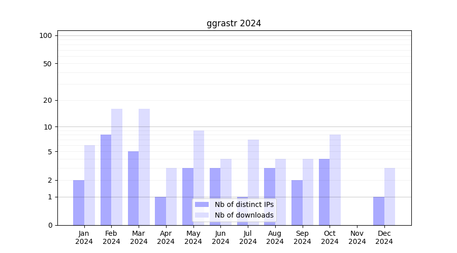 Number of downloads for workflow package ggrastr, year by year, from 2025 back to 2015 (years with no downloads are omitted):