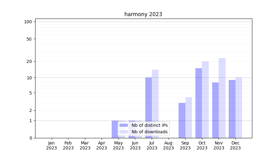 Number of downloads for workflow package harmony, year by year, from 2025 back to 2015 (years with no downloads are omitted):