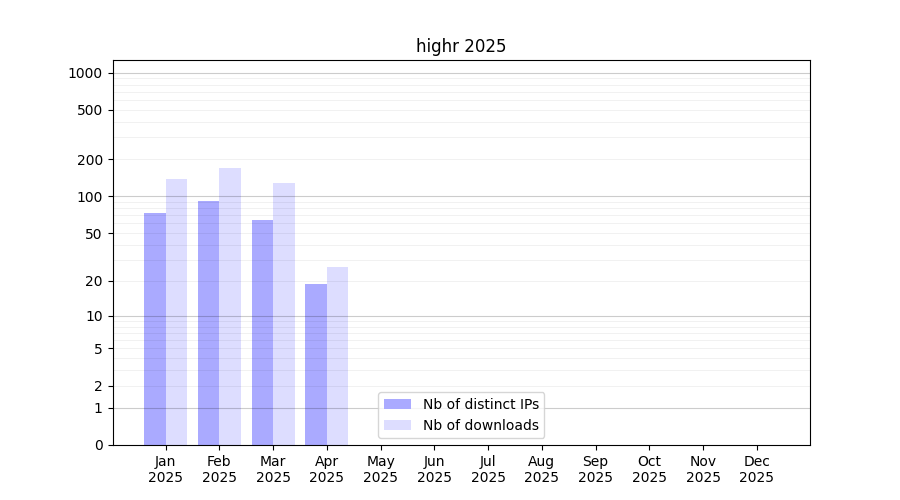Number of downloads for workflow package highr, year by year, from 2025 back to 2015 (years with no downloads are omitted):