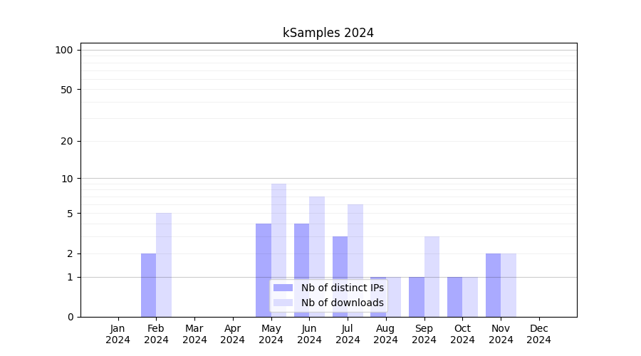 Number of downloads for workflow package kSamples, year by year, from 2025 back to 2015 (years with no downloads are omitted):