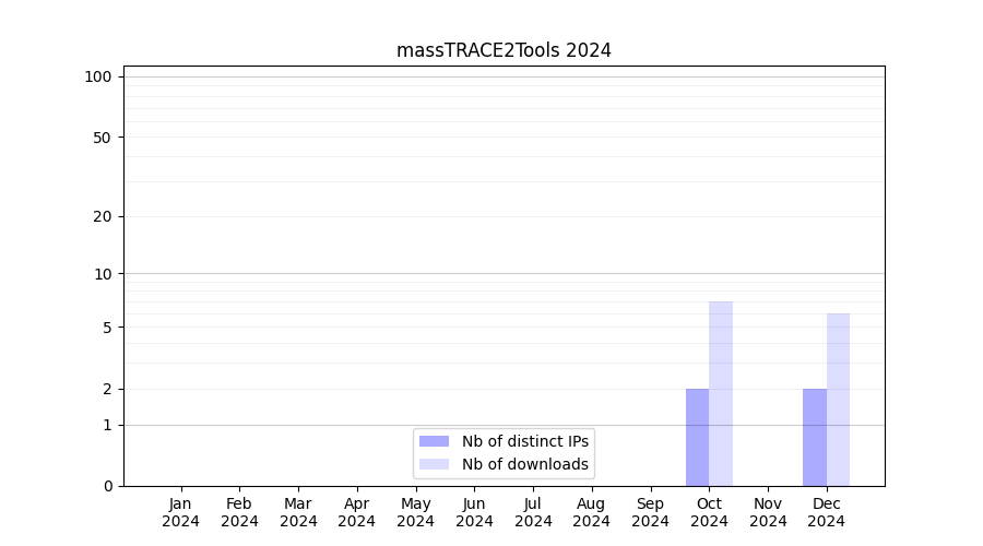 Number of downloads for workflow package massTRACE2Tools, year by year, from 2025 back to 2015 (years with no downloads are omitted):