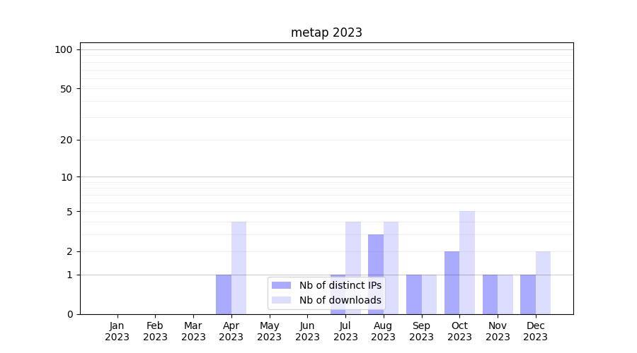Number of downloads for workflow package metap, year by year, from 2025 back to 2015 (years with no downloads are omitted):