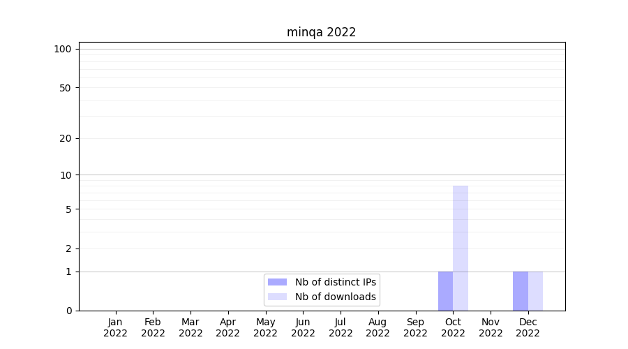 Number of downloads for workflow package minqa, year by year, from 2025 back to 2015 (years with no downloads are omitted):