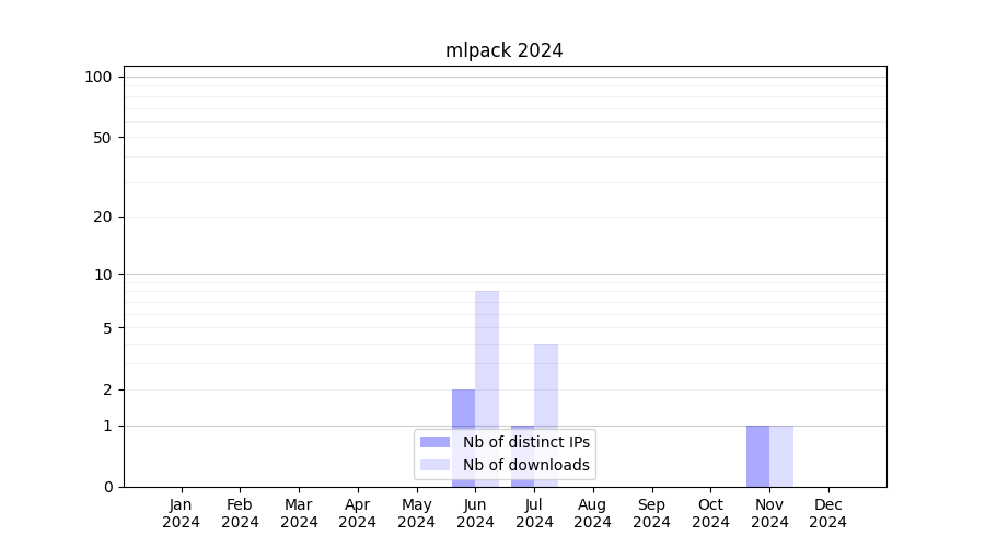 Number of downloads for workflow package mlpack, year by year, from 2025 back to 2015 (years with no downloads are omitted):