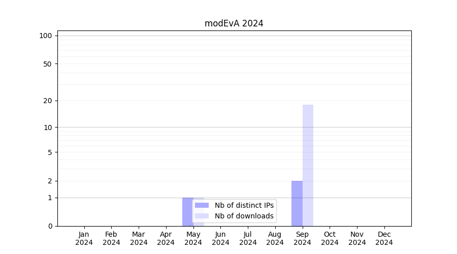 Number of downloads for workflow package modEvA, year by year, from 2025 back to 2015 (years with no downloads are omitted):