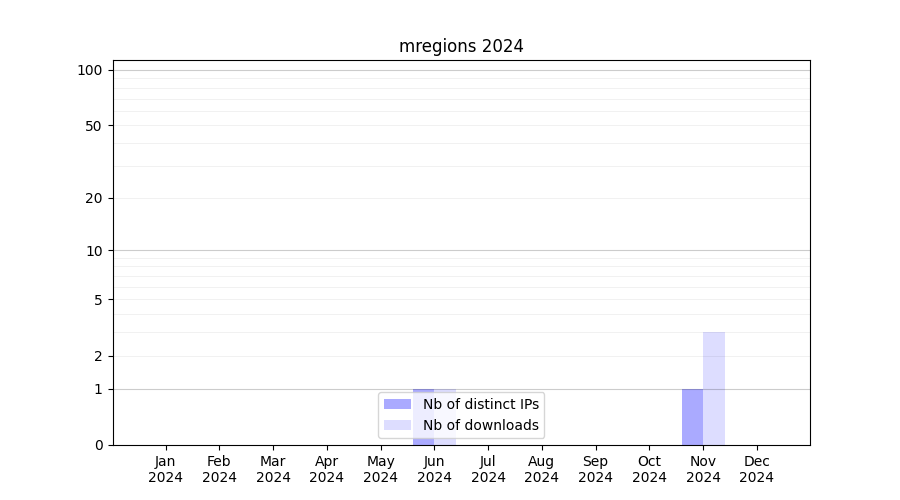 Number of downloads for workflow package mregions, year by year, from 2025 back to 2015 (years with no downloads are omitted):