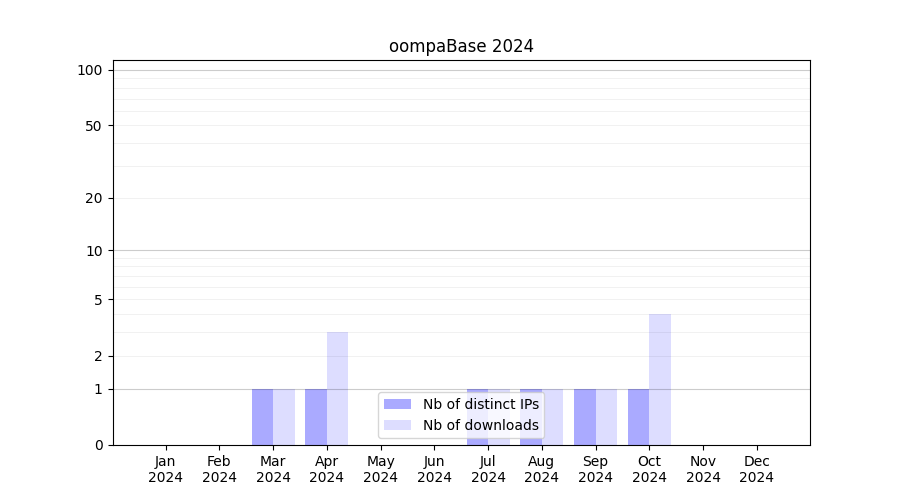 Number of downloads for workflow package oompaBase, year by year, from 2025 back to 2015 (years with no downloads are omitted):