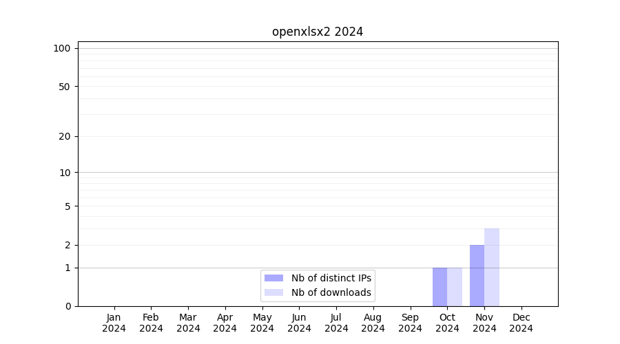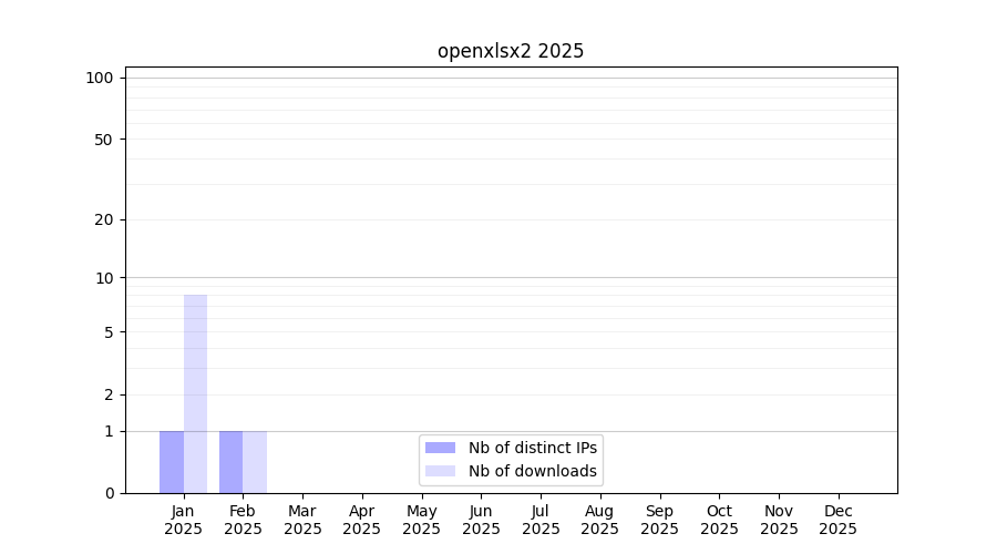 Number of downloads for workflow package openxlsx2, year by year, from 2025 back to 2015 (years with no downloads are omitted):