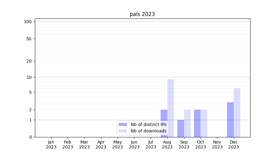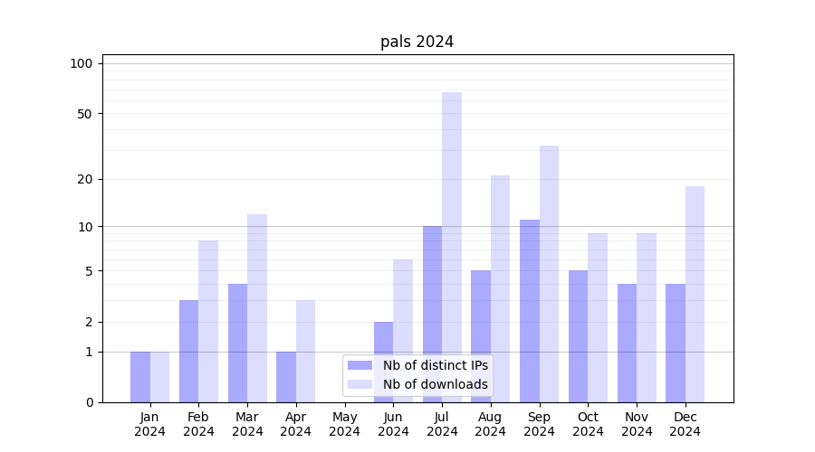 Number of downloads for workflow package pals, year by year, from 2025 back to 2015 (years with no downloads are omitted):