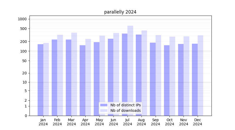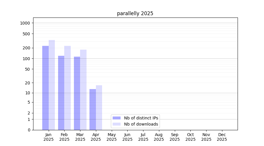 Number of downloads for workflow package parallelly, year by year, from 2025 back to 2015 (years with no downloads are omitted):