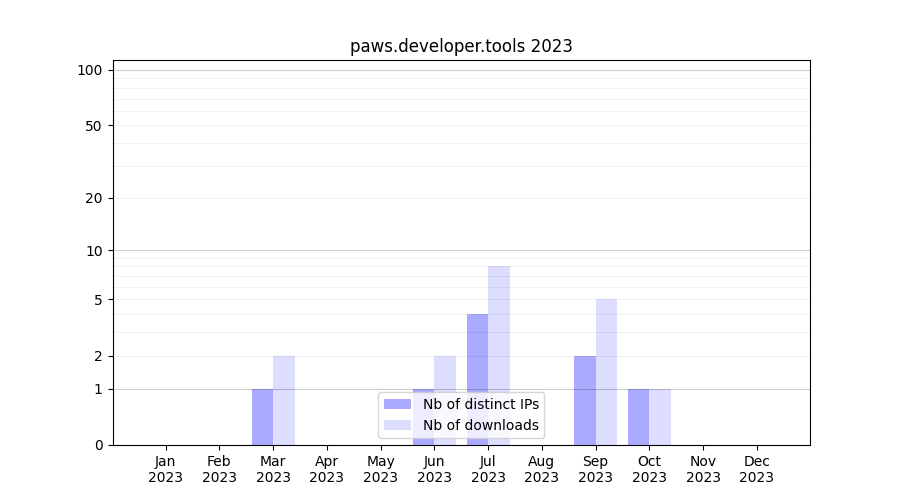 Number of downloads for workflow package paws.developer.tools, year by year, from 2025 back to 2015 (years with no downloads are omitted):