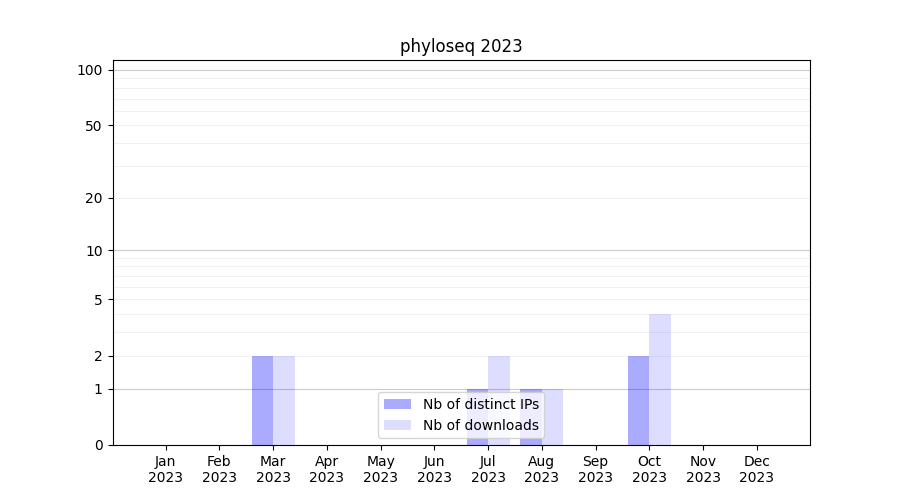 Number of downloads for workflow package phyloseq, year by year, from 2025 back to 2015 (years with no downloads are omitted):