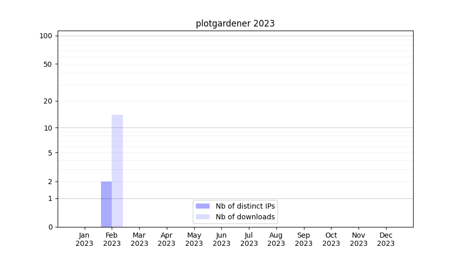 Number of downloads for workflow package plotgardener, year by year, from 2025 back to 2015 (years with no downloads are omitted):