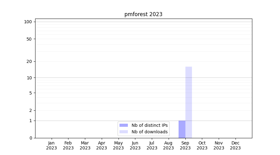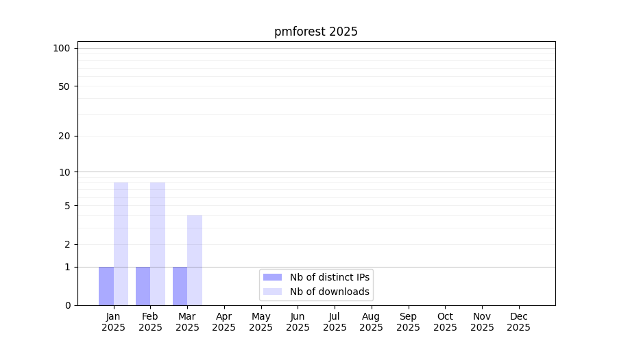Number of downloads for workflow package pmforest, year by year, from 2025 back to 2015 (years with no downloads are omitted):