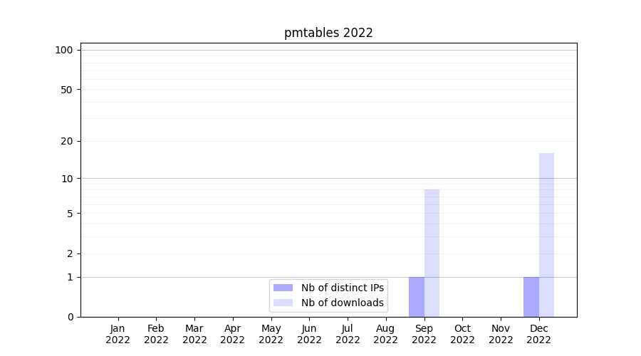 Number of downloads for workflow package pmtables, year by year, from 2025 back to 2015 (years with no downloads are omitted):