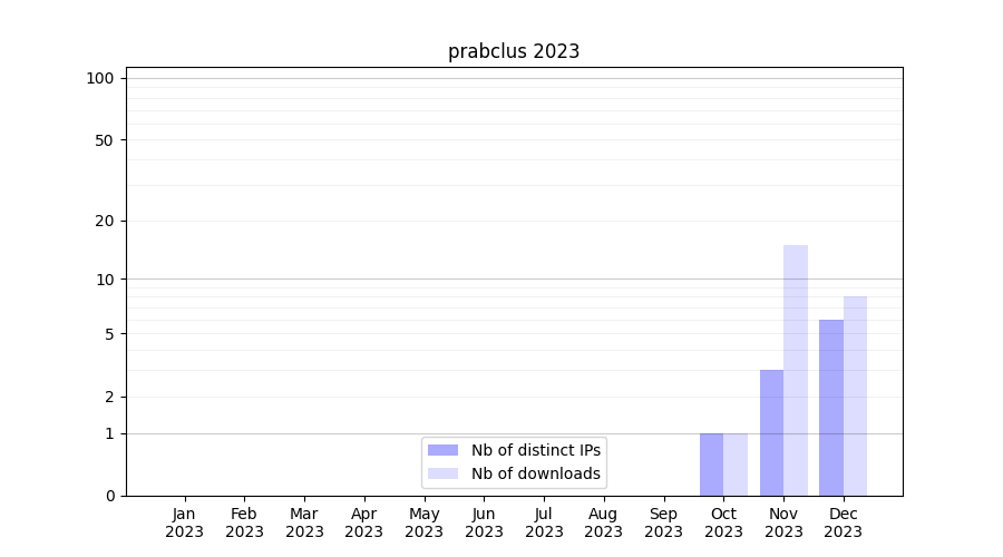 Number of downloads for workflow package prabclus, year by year, from 2025 back to 2015 (years with no downloads are omitted):