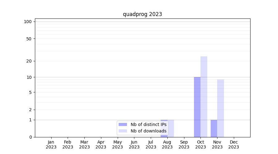 Number of downloads for workflow package quadprog, year by year, from 2025 back to 2015 (years with no downloads are omitted):