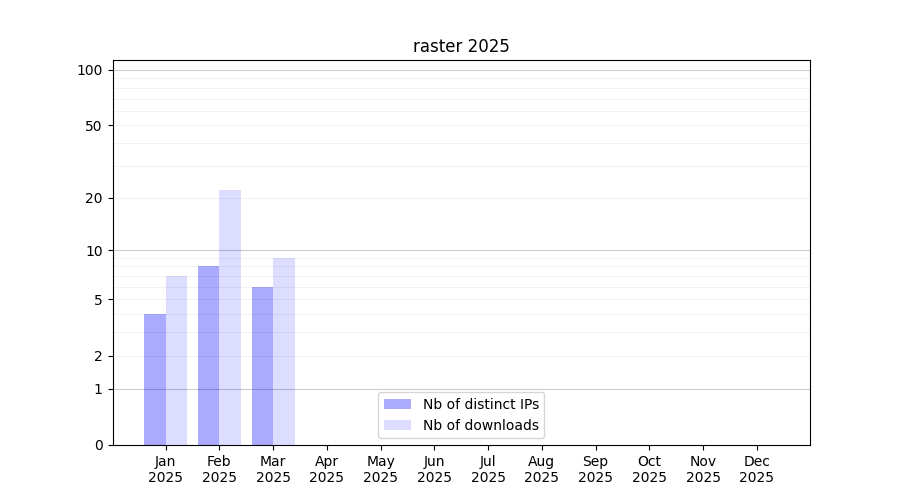 Number of downloads for workflow package raster, year by year, from 2025 back to 2015 (years with no downloads are omitted):