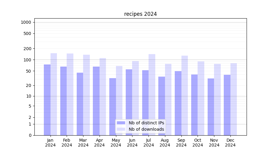 Number of downloads for workflow package recipes, year by year, from 2025 back to 2015 (years with no downloads are omitted):