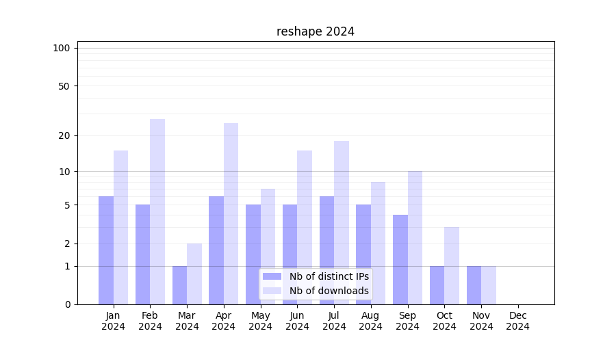 Number of downloads for workflow package reshape, year by year, from 2025 back to 2015 (years with no downloads are omitted):