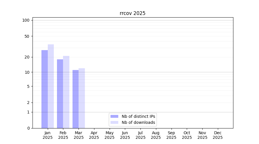Number of downloads for workflow package rrcov, year by year, from 2025 back to 2015 (years with no downloads are omitted):