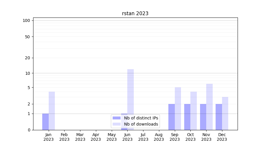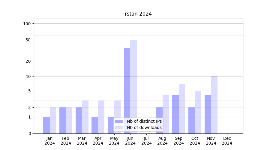 Number of downloads for workflow package rstan, year by year, from 2025 back to 2015 (years with no downloads are omitted):