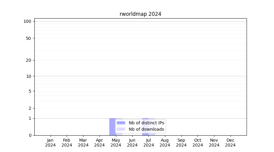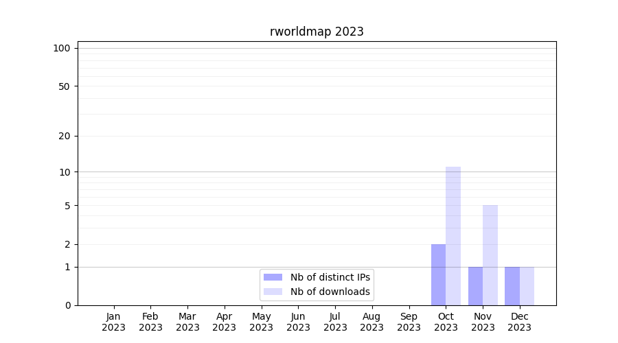 Number of downloads for workflow package rworldmap, year by year, from 2025 back to 2015 (years with no downloads are omitted):