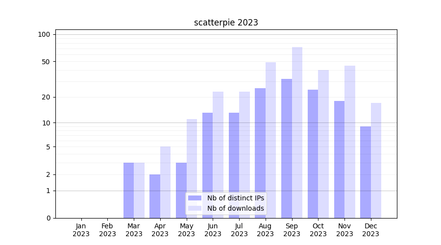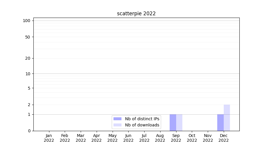 Number of downloads for workflow package scatterpie, year by year, from 2025 back to 2015 (years with no downloads are omitted):