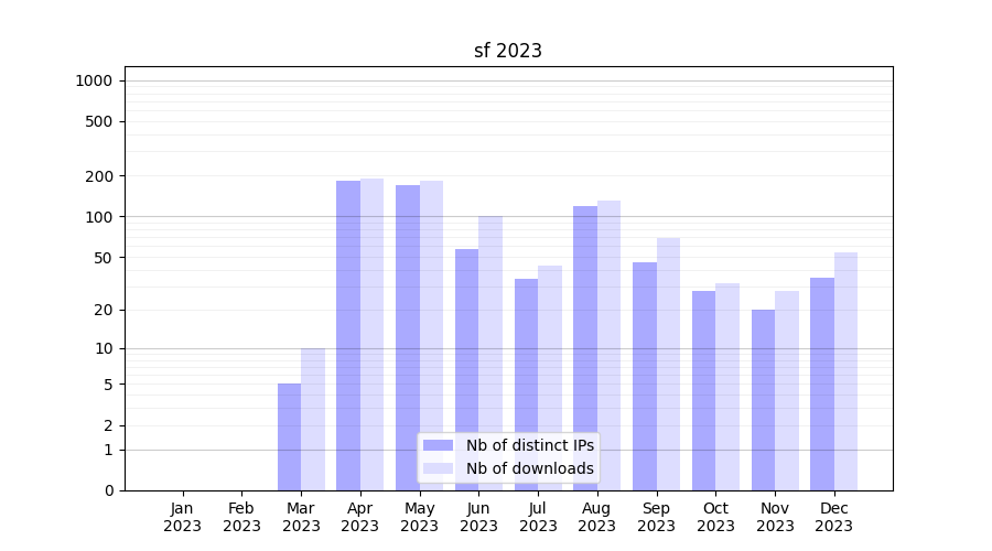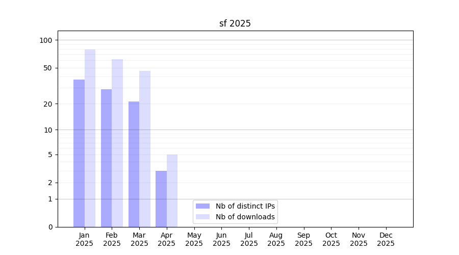 Number of downloads for workflow package sf, year by year, from 2025 back to 2015 (years with no downloads are omitted):