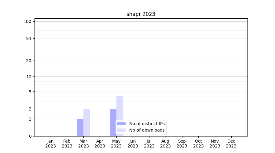 Number of downloads for workflow package shapr, year by year, from 2025 back to 2015 (years with no downloads are omitted):