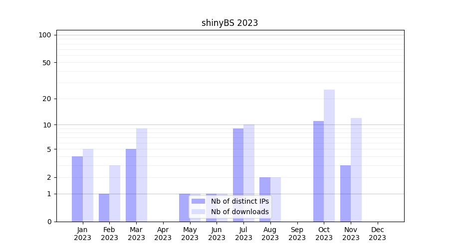 Number of downloads for workflow package shinyBS, year by year, from 2025 back to 2015 (years with no downloads are omitted):
