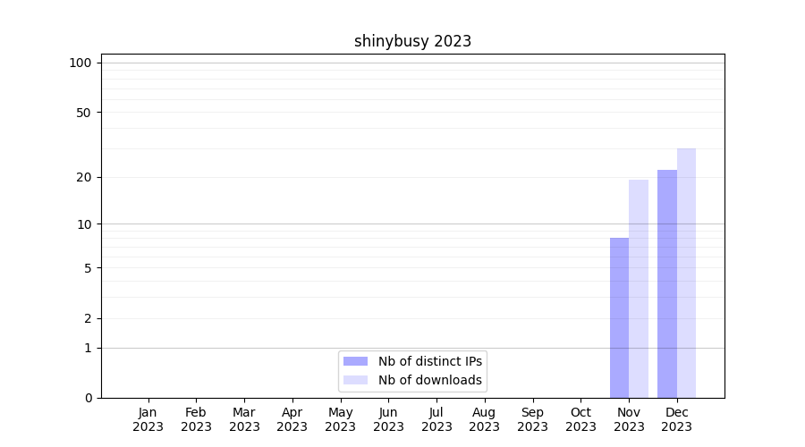 Number of downloads for workflow package shinybusy, year by year, from 2025 back to 2015 (years with no downloads are omitted):