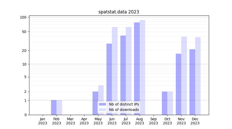Number of downloads for workflow package spatstat.data, year by year, from 2025 back to 2015 (years with no downloads are omitted):
