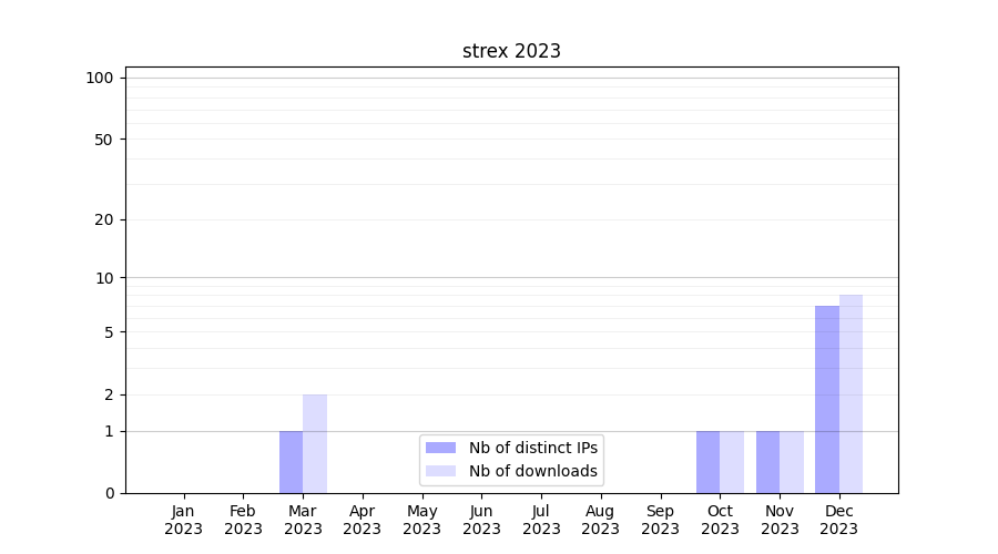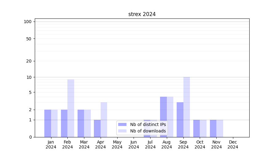 Number of downloads for workflow package strex, year by year, from 2025 back to 2015 (years with no downloads are omitted):