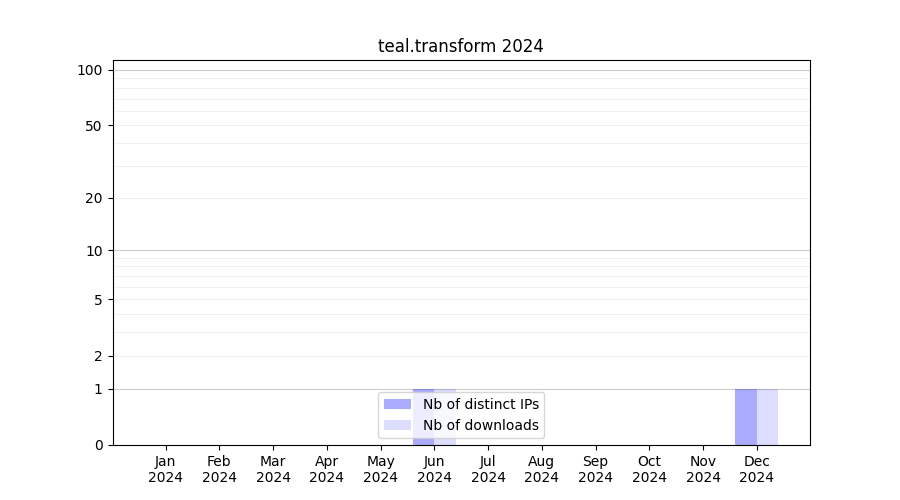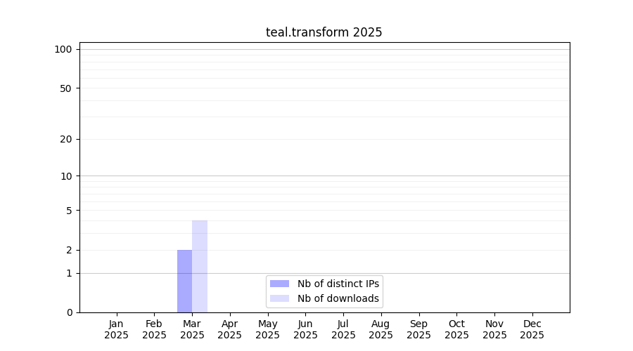 Number of downloads for workflow package teal.transform, year by year, from 2025 back to 2015 (years with no downloads are omitted):