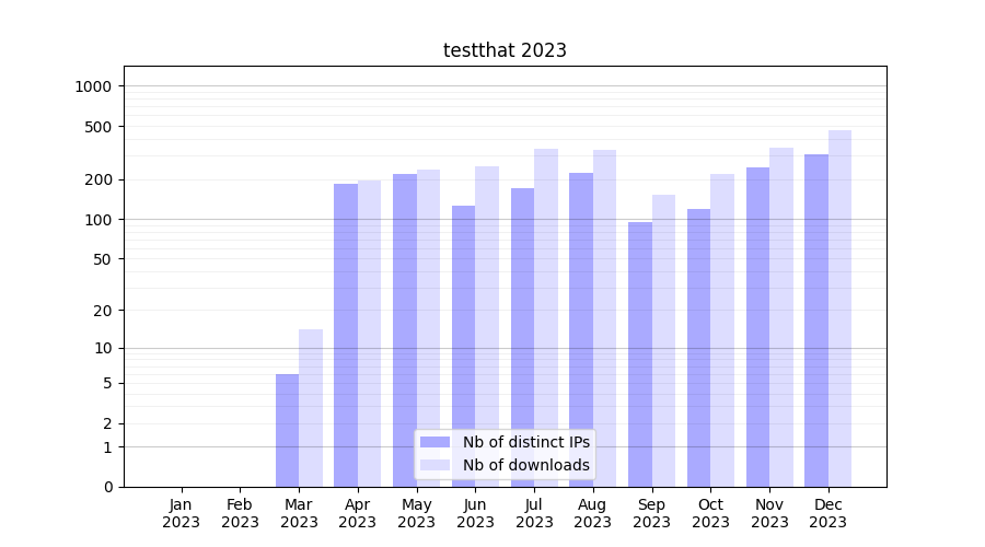 Number of downloads for workflow package testthat, year by year, from 2025 back to 2015 (years with no downloads are omitted):