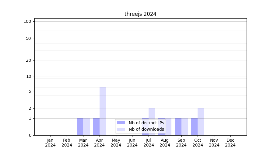 Number of downloads for workflow package threejs, year by year, from 2025 back to 2015 (years with no downloads are omitted):