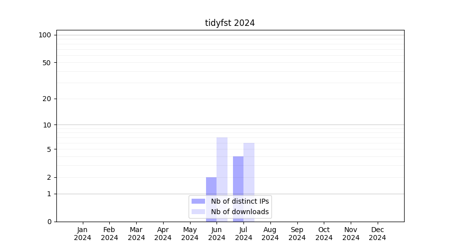 Number of downloads for workflow package tidyfst, year by year, from 2025 back to 2015 (years with no downloads are omitted):