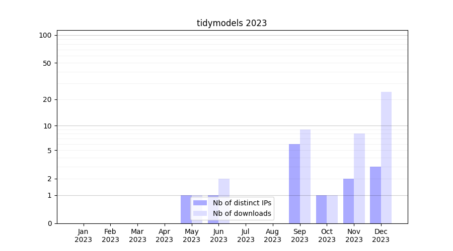 Number of downloads for workflow package tidymodels, year by year, from 2025 back to 2015 (years with no downloads are omitted):