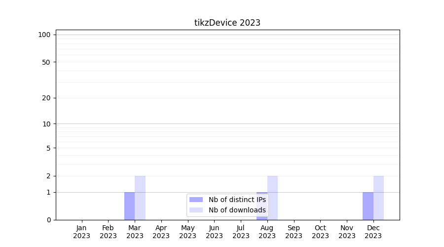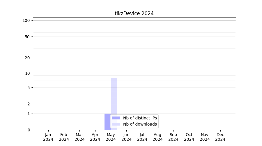 Number of downloads for workflow package tikzDevice, year by year, from 2025 back to 2015 (years with no downloads are omitted):