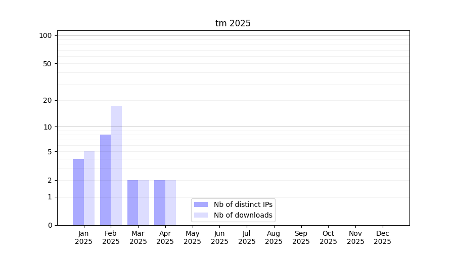 Number of downloads for workflow package tm, year by year, from 2025 back to 2015 (years with no downloads are omitted):