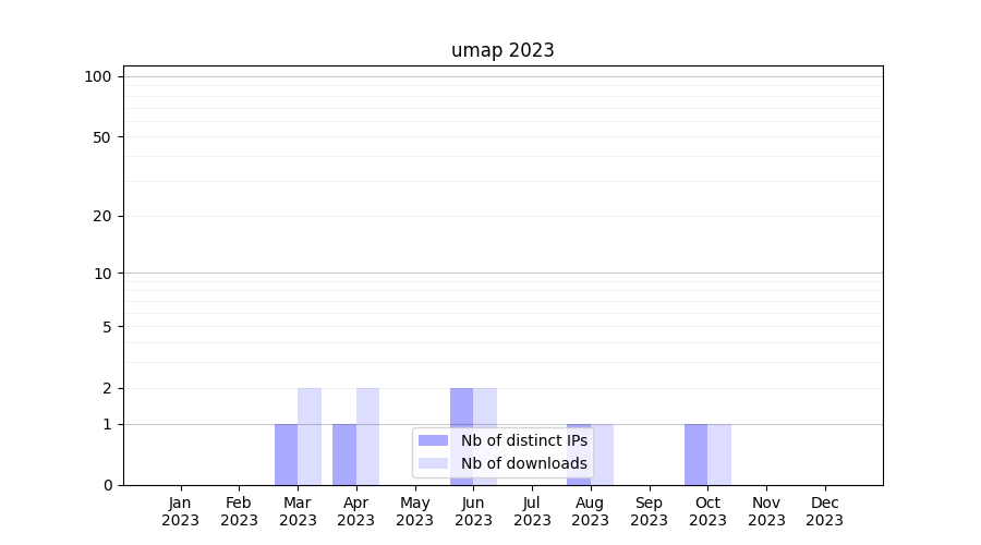 Number of downloads for workflow package umap, year by year, from 2025 back to 2015 (years with no downloads are omitted):
