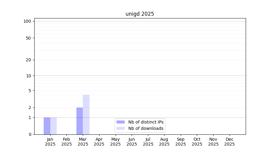 Number of downloads for workflow package unigd, year by year, from 2025 back to 2015 (years with no downloads are omitted):