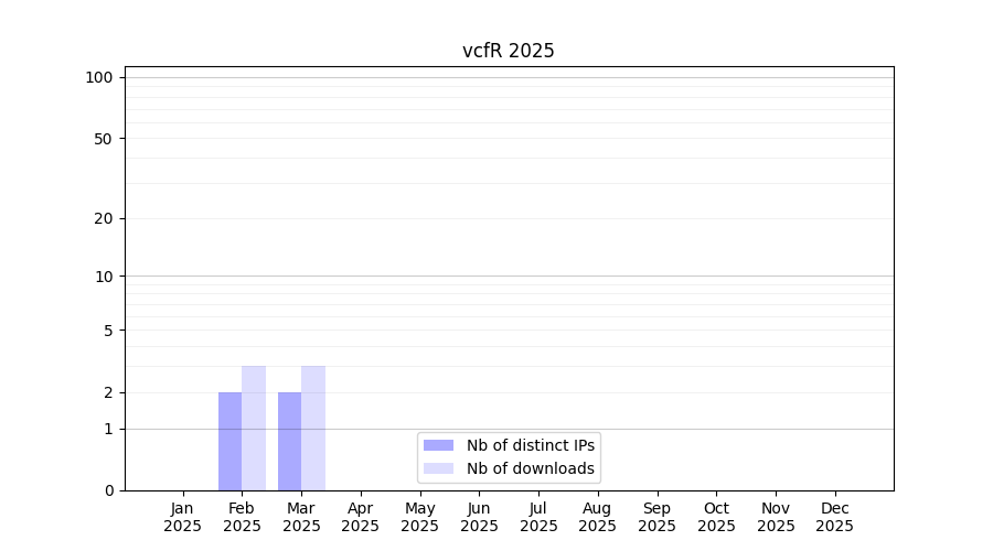 Number of downloads for workflow package vcfR, year by year, from 2025 back to 2015 (years with no downloads are omitted):