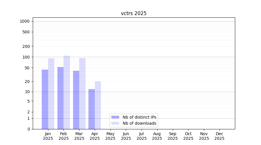 Number of downloads for workflow package vctrs, year by year, from 2025 back to 2015 (years with no downloads are omitted):