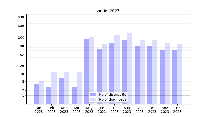 Number of downloads for workflow package viridis, year by year, from 2025 back to 2015 (years with no downloads are omitted):