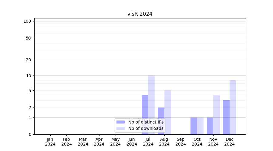 Number of downloads for workflow package visR, year by year, from 2025 back to 2015 (years with no downloads are omitted):