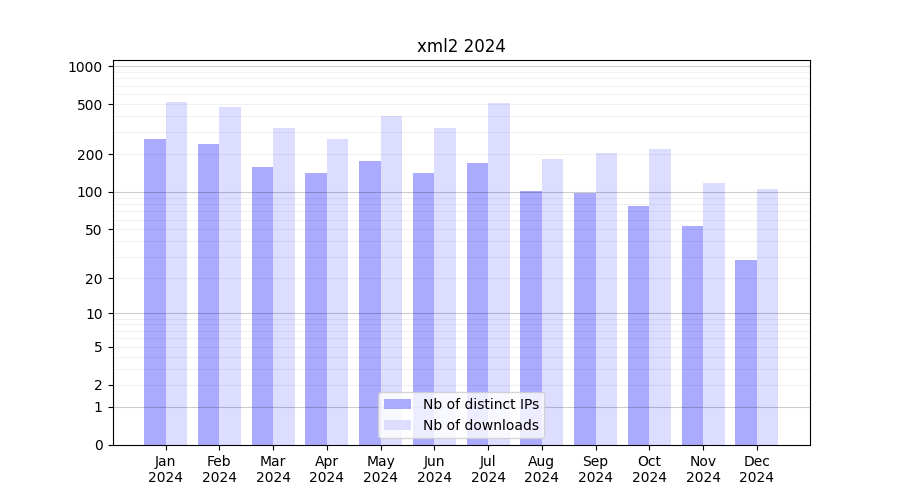 Number of downloads for workflow package xml2, year by year, from 2025 back to 2015 (years with no downloads are omitted):