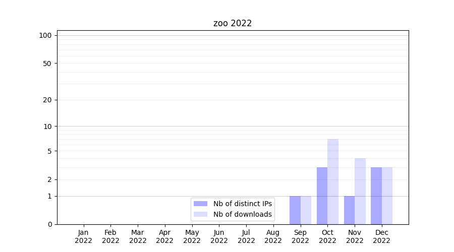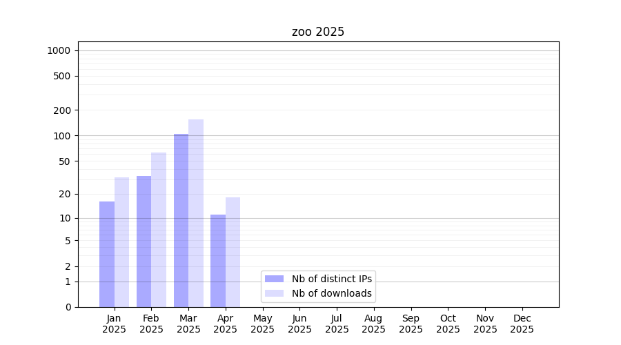 Number of downloads for workflow package zoo, year by year, from 2025 back to 2015 (years with no downloads are omitted):